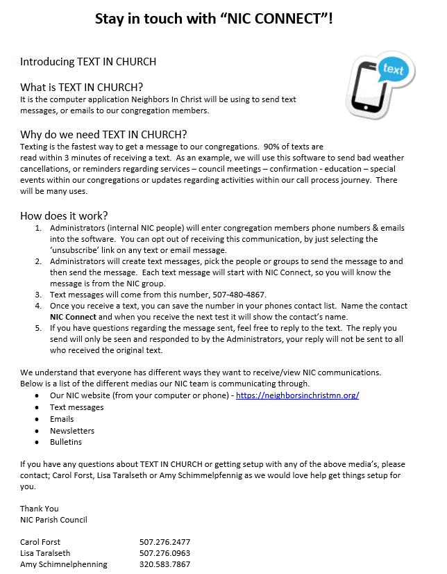 * Communication will be delivered through the worship bulletins, the newsletter, text, email & our website.