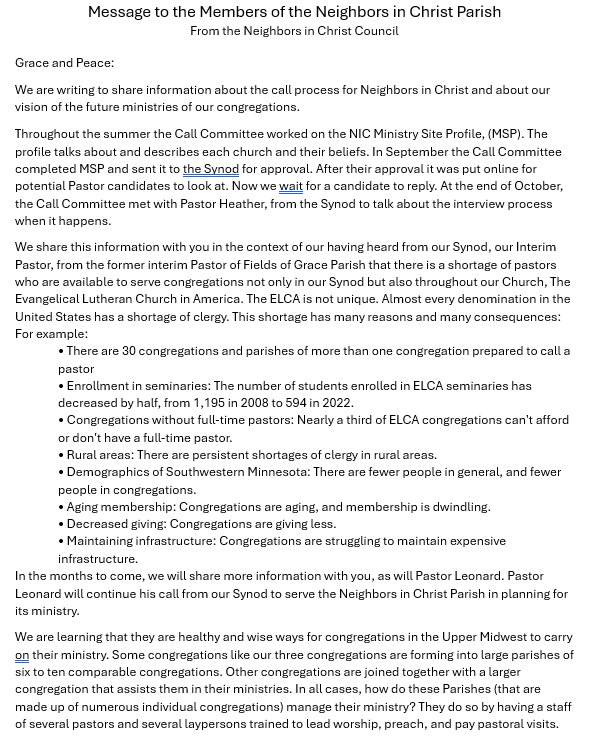 These groups were formed to help us organize and manage Church work while we are in this pulpit supply chapter. These groups may change or responsibilities within them as we move through this process of calling our next Pastor.